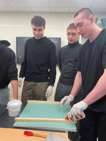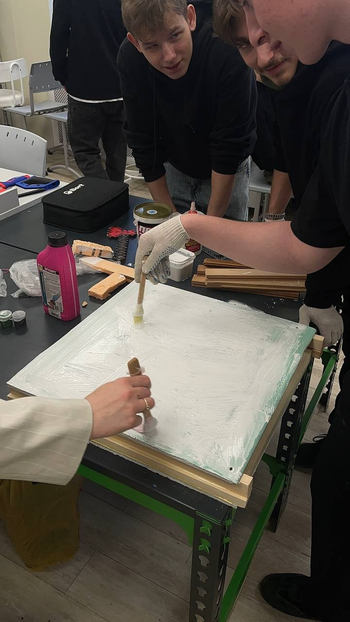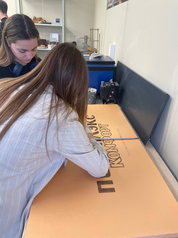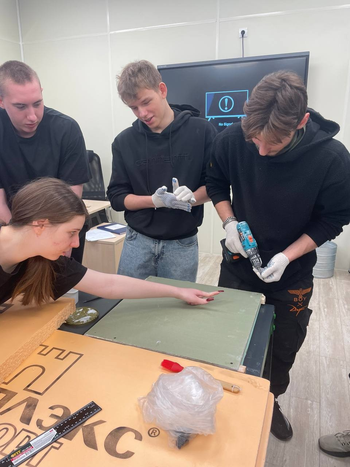 Главным проектировщиком стала Омшина Алиса — она подготовила методику для занятия. Варцаба Влад, Павлов Сергей, Павленко Артём и Хорешок Данил взялись за дело: распилили и собрали каркас, установили гипсокартон и утеплитель.