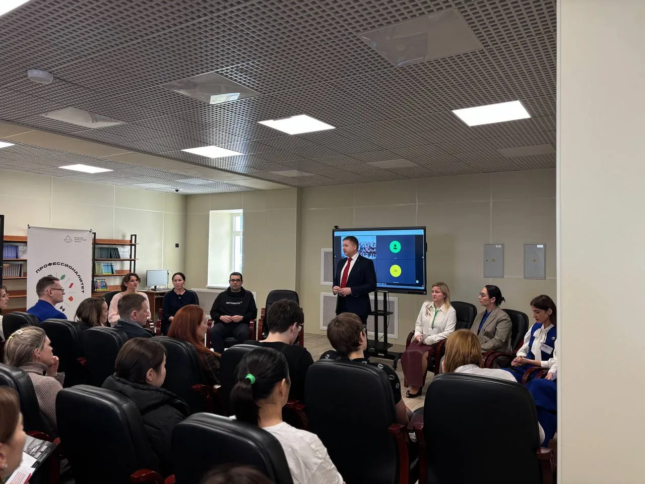 Отдельно выступили представители Кадрового центра «Работа в России». Они рассказали о мерах поддержки, возможностях сопровождения молодых специалистов и о том, как выстраивается маршрут от обучения к дальнейшему трудоустройству.
